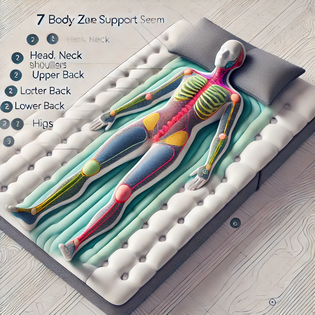 “7 Body Zone Support System” หรือระบบสนับสนุนร่างกายแบบ 7 โซน เป็นเทคโนโลยีที่มักใช้ในที่นอนหรือเบาะรองนั่ง เพื่อเพิ่มความสะดวกสบายและรองรับสรีระร่างกายให้เหมาะสมในแต่ละส่วน โดยปกติจะออกแบบมาให้รองรับส่วนต่าง ๆ ของร่างกาย ได้แก่ ศีรษะ คอ ไหล่ หลัง สะโพก ต้นขา และขา โดยข้อมูลเกี่ยวกับระบบนี้สามารถอธิบายเพิ่มเติมในด้านต่าง ๆ ดังนี้: